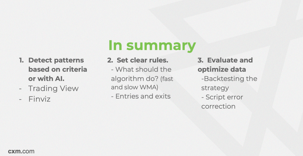 Everything starts with a simple hypothesis: “when the RSI crosses above its moving average, the price tends to rise.” With historical feeds from TradingView or FinViz, you collect the data that will feed the algorithm. ChatGPT helps translate the hypothesis into clear rules.