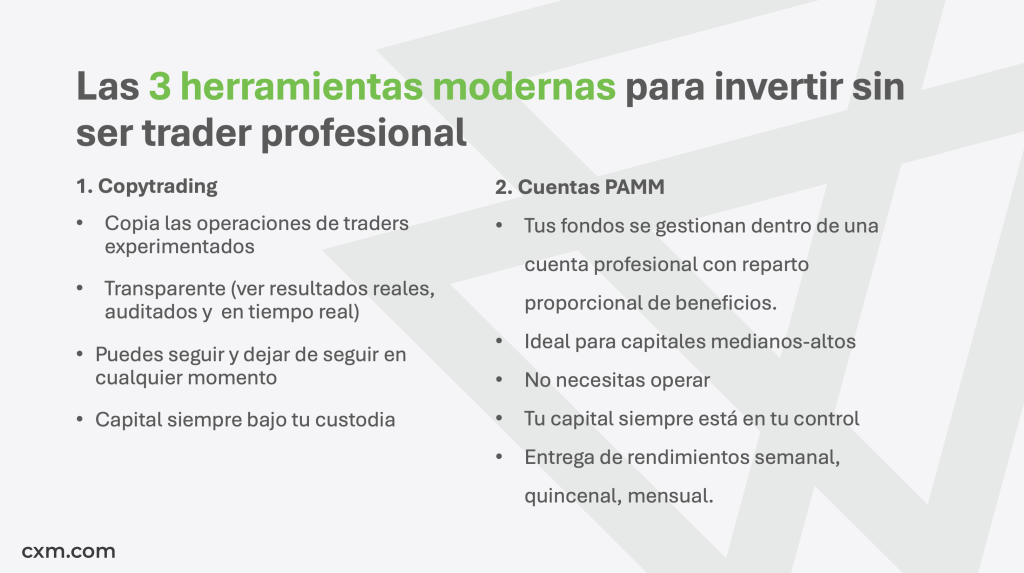 Aquí los fondos se agrupan en una cuenta gestionada por un profesional que reparte beneficios de forma proporcional. Requiere un capital medio o alto, pero permite delegar la operativa diaria y recibir reportes periódicos de rendimiento. Perfecto para perfiles que valoran la comodidad sin renunciar al control global de su dinero.