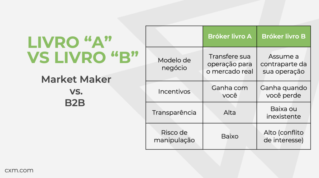Aqui surge a disjuntiva Market Maker (Livro B) versus B2B ou STP/ECN (Livro A). Um bróker Livro B costuma atuar como contraparte direta: se o cliente ganha, o bróker perde, e vice-versa. Isso não implica fraude automática, mas traz um conflito de interesses inerente