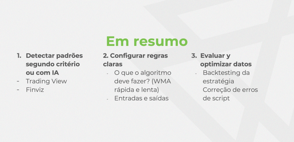 Tudo começa com uma hipótese simples: “quando o RSI cruza acima da sua média móvel, o preço tende a subir”. Com históricos do TradingView ou FinViz, reúnem-se os dados que alimentarão o algoritmo. O ChatGPT ajuda a traduzir a hipótese em regras claras.