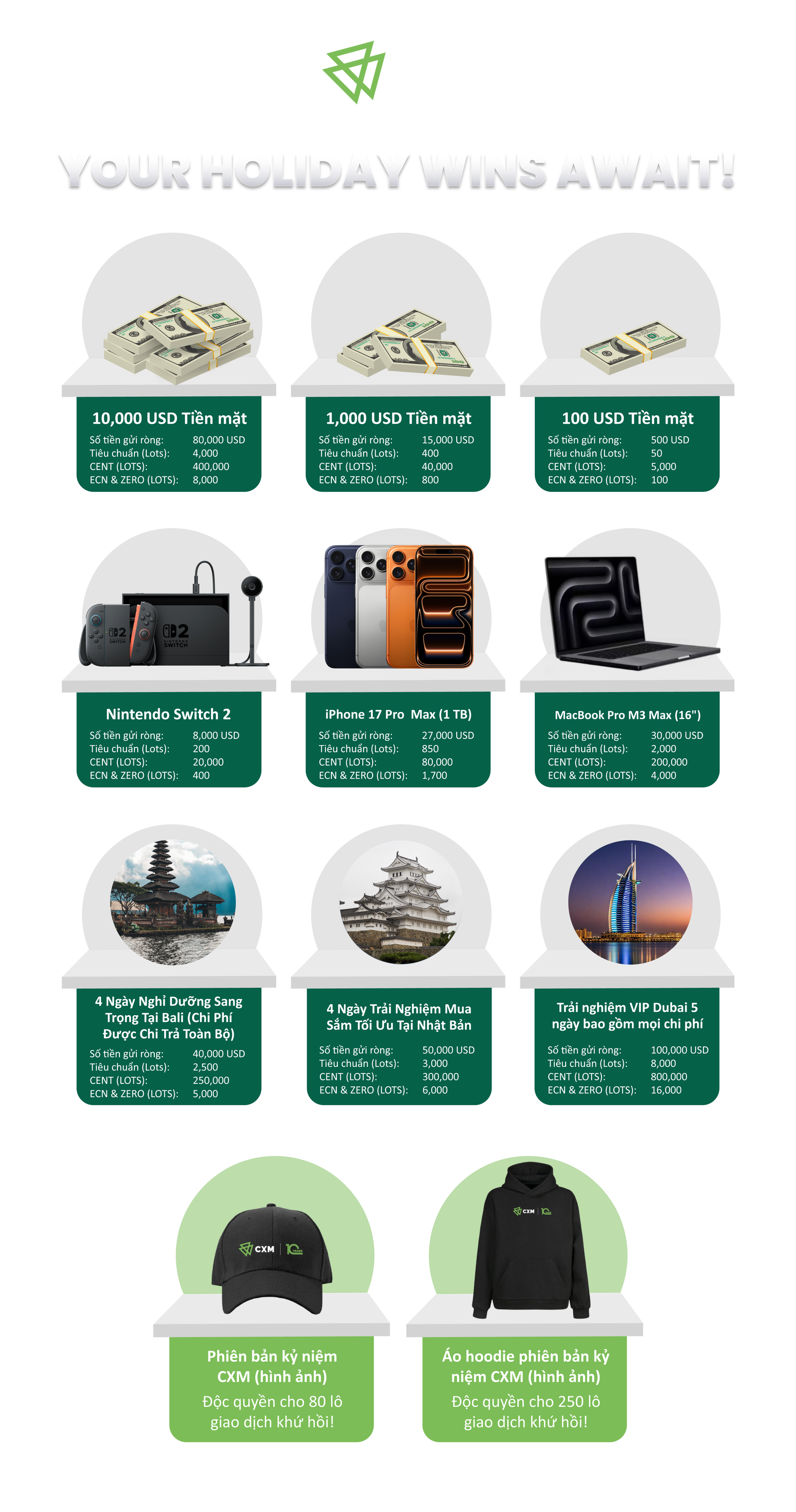 Để tham gia chương trình Merry Trades & Festive Wins của CXM, hãy hoàn thành và nộp đơn đăng ký trên trang khuyến mãi chính thức. Mỗi giao dịch bạn thực hiện sẽ giúp bạn tiến gần hơn đến những giải thưởng hấp dẫn trong mùa lễ hội — giao dịch càng nhiều, phần thưởng bạn nhận được càng lớn trong mùa lễ hội này!